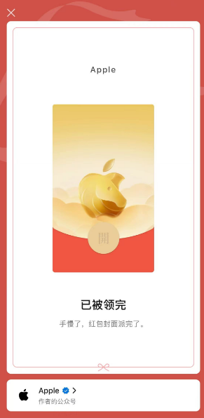值得注意的是,1月6日零点,苹果正式上线马年特别设计。为迎接2月17日的农历春节,苹果在微信公众号发放了首波马年微信红包封面,所有用户均可免费领取。
