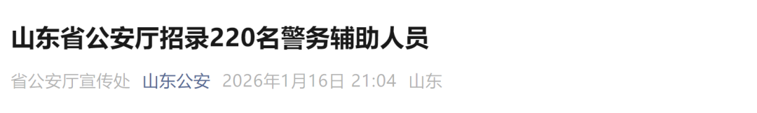 近日,据山东公安消息,山东省公安厅招录220名警务辅助人员,具体如下: