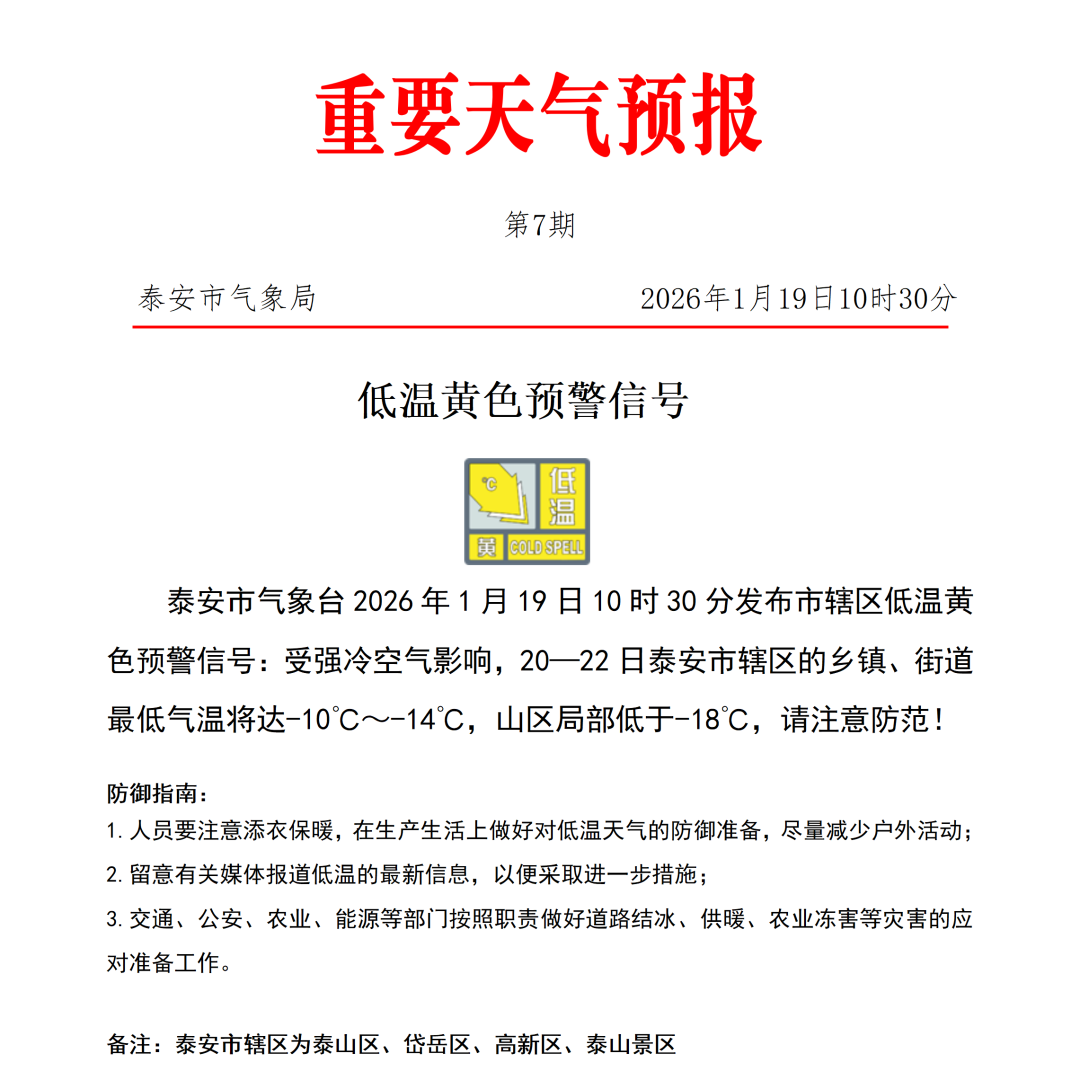 泰安市气象台2026年1月19日10时30分发布市辖区低温黄色预警信号:受强冷空气影响,20—22日泰安市辖区的乡镇、街道最低气温将达-10℃~-14℃,山区局部低于-18℃,请注意防范!