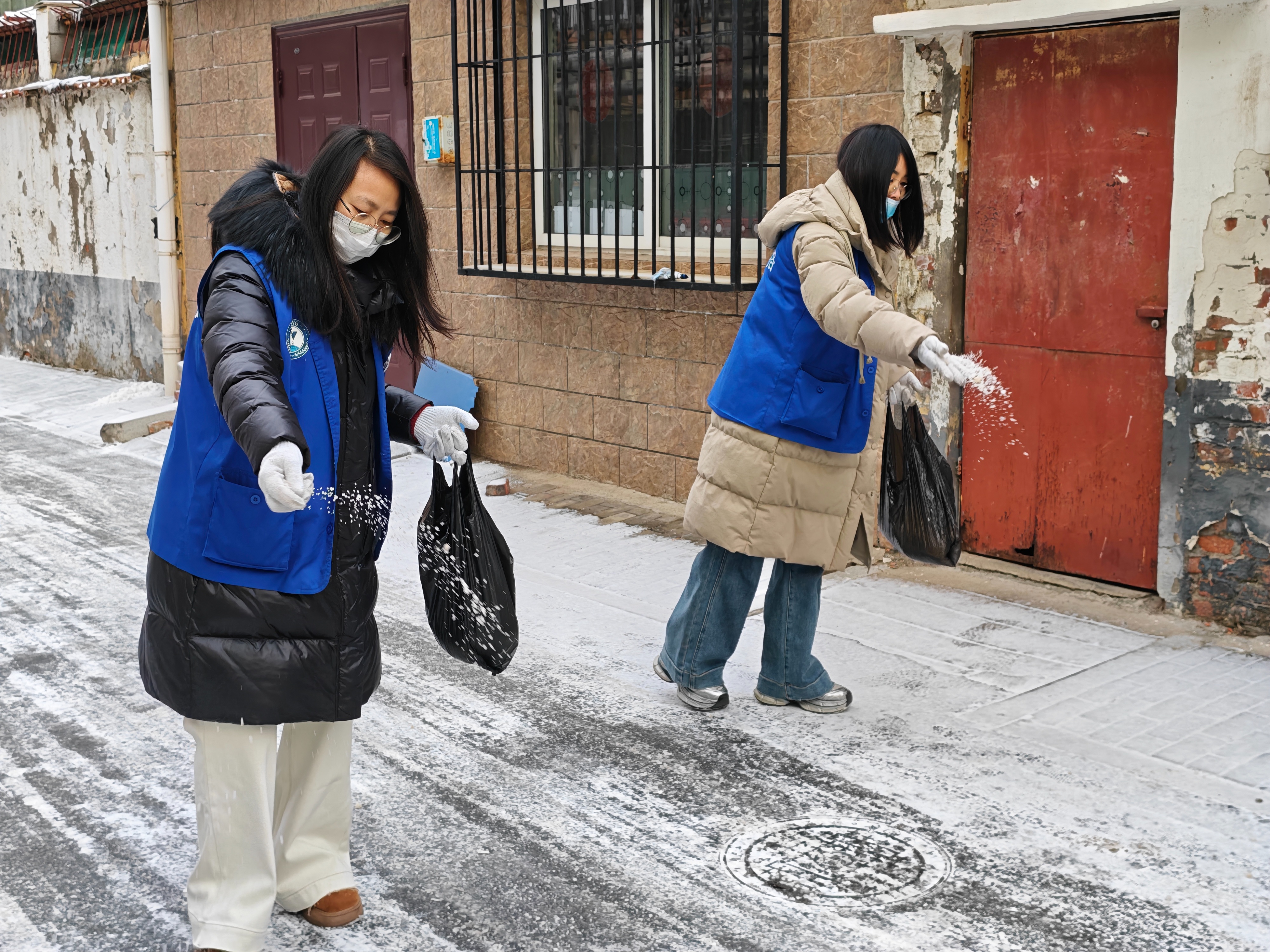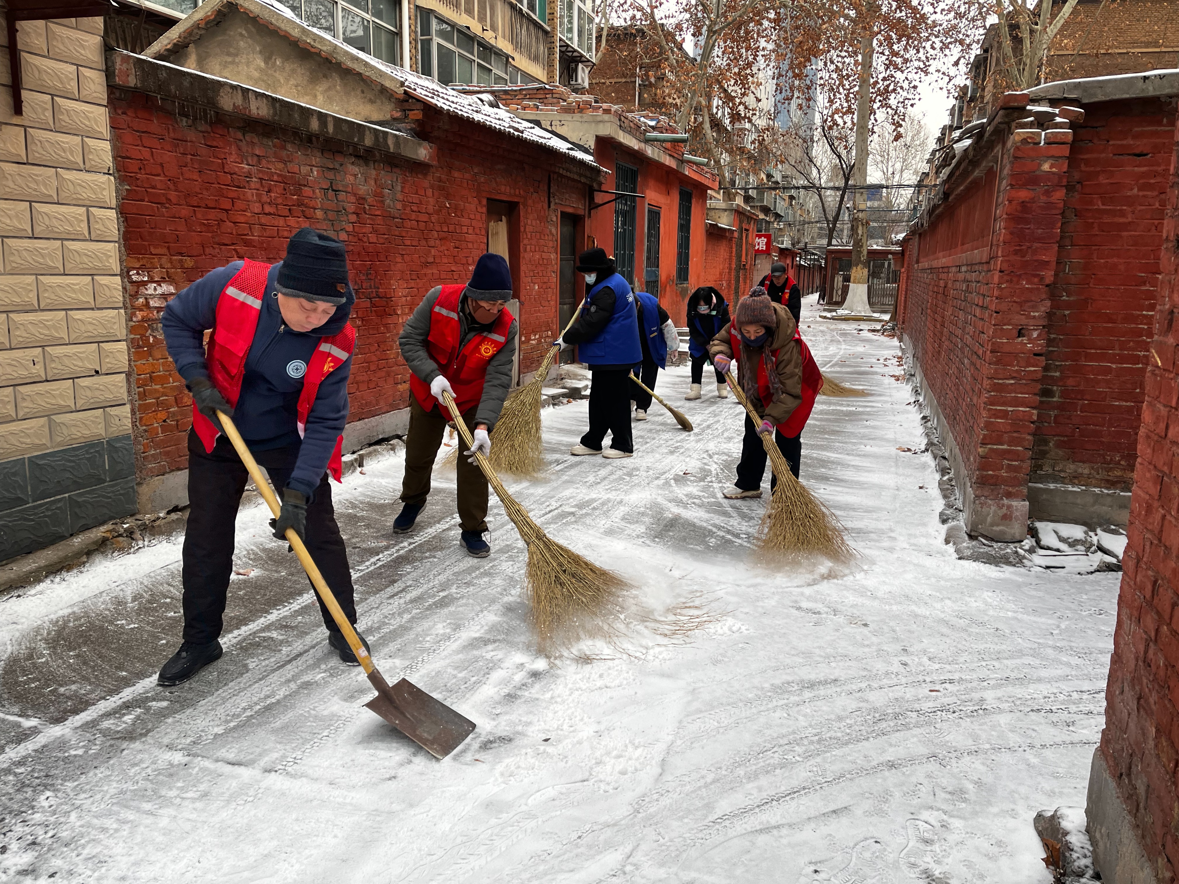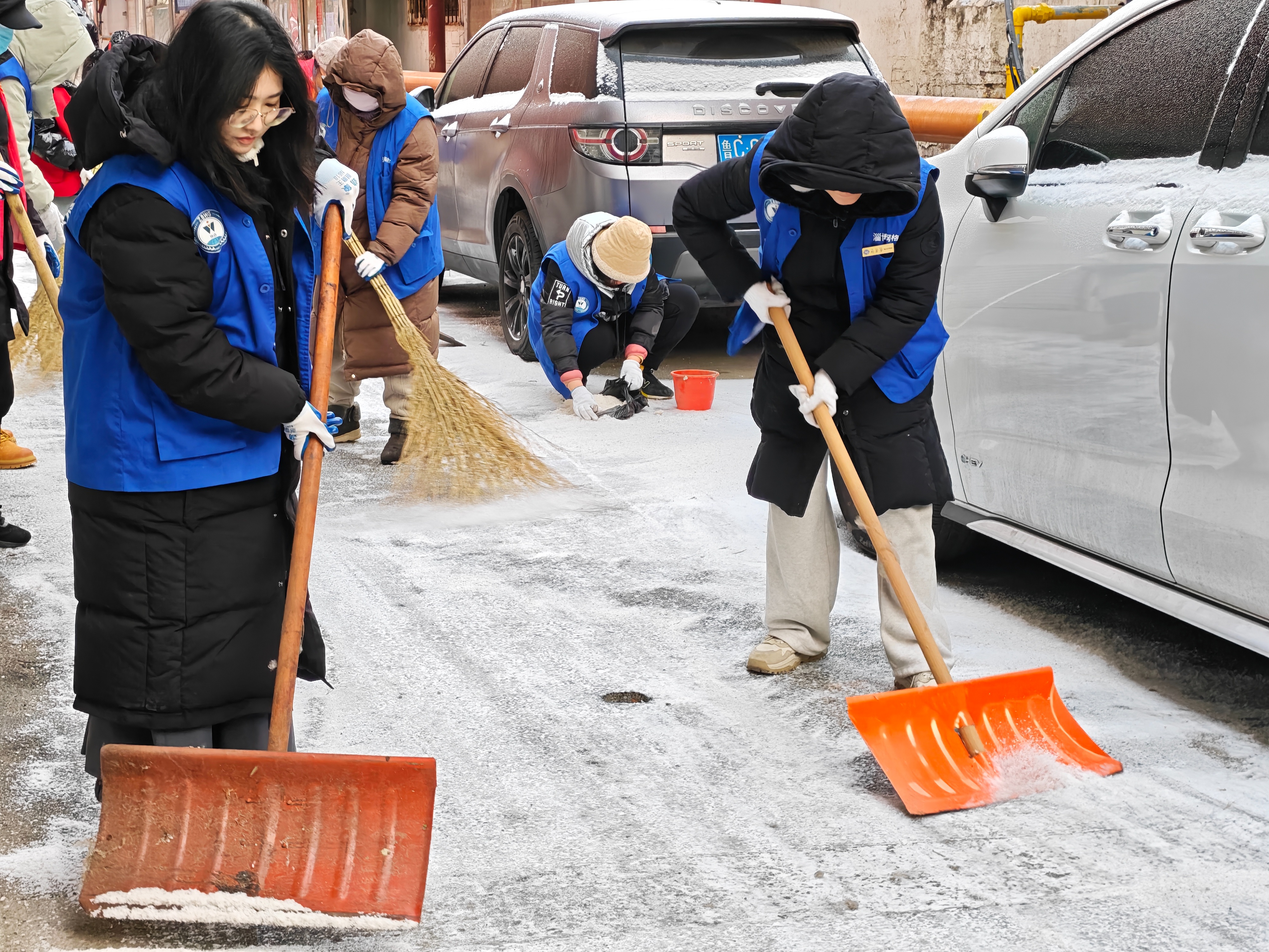 各社区第一时间响应街道部署,迅速组织社区工作人员、党员志愿者、物业人员、网格员及热心居民,手持铁锹、推雪板等工具,奔赴辖区主次干道、背街小巷、居民小区出入口、单元门口、地下车库坡道、商超周边等群众出行高频区域开展清雪作业。大家采取“人工清扫+撒布融雪剂”相结合的方式,分工明确、配合默契,铲冰、扫雪一气呵成,全力清除道路通行障碍。