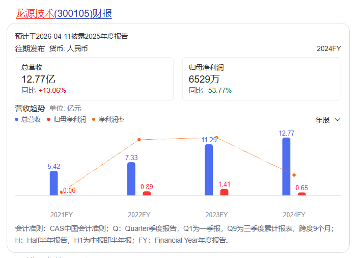 业绩方面,龙源技术2024年营业收入为12.77亿元,同比增长13.06%;归母净利润为6528.75万元,同比下降53.77%;扣非归母净利润为5464.39万元,同比下降59.50%;基本每股收益0.13元。