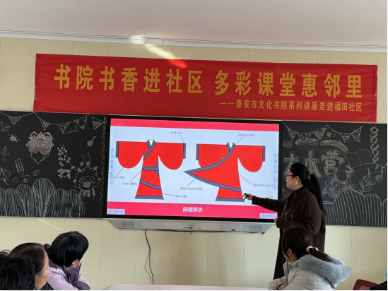 随后,“赏华服之美,展民族自信”课堂上,山东服装职业学院教师祖园园从华服的历史源流、审美内涵和文化精神切入,带领居民系统梳理了中华服饰数千年的演变脉络,阐释了华服在礼仪制度、哲学思想和民族精神传承中的重要价值。讲座结合当代设计案例,介绍了传统工艺在现代服装中的创新应用,并通过高清图片和工艺视频展示,让居民直观感受缂丝、云锦、刺绣等非遗技艺的匠心之美,在“可看、可感、可思”中增强文化认同与民族自信。