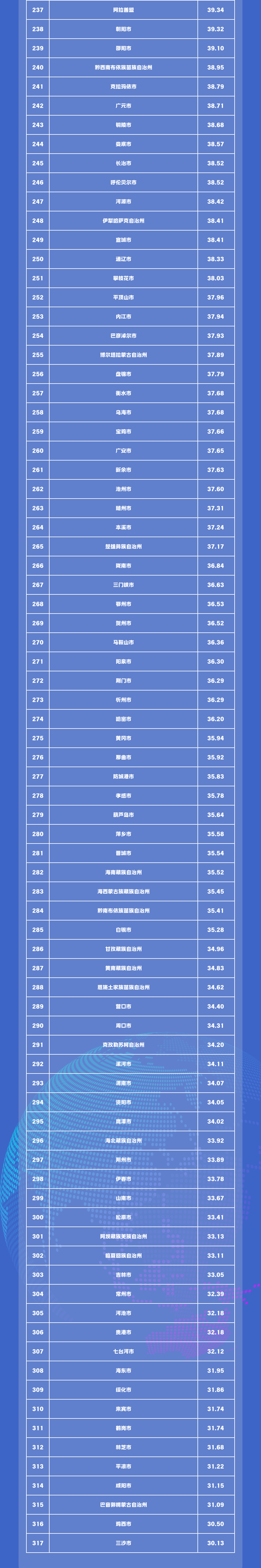 本报告通过综合模型计算分析得出我国338座内地城市(自治州、地区、盟,今年纳入雄安新区)的海外网络传播力综合指数,并进一步在各省份内部查看各城市在其所属省级行政区划内的得分情况。