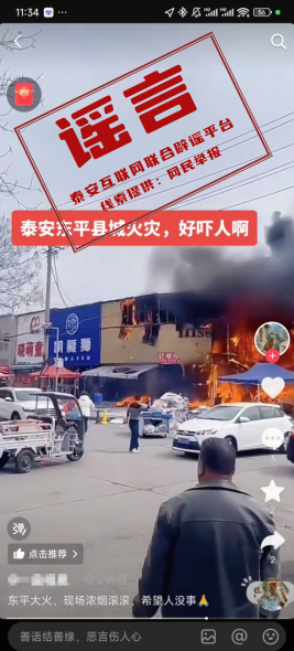真相:3月,一用户在视频平台发布了一则“泰安东平县城火灾,好吓人啊”引发网民关注。经查,寇某某为蹭炒热点、吸粉引流,将外省某地失火视频,张冠李戴编辑为“泰安东平县城火灾”。寇某某因虚构事实,扰乱公共秩序被依法行政拘留。