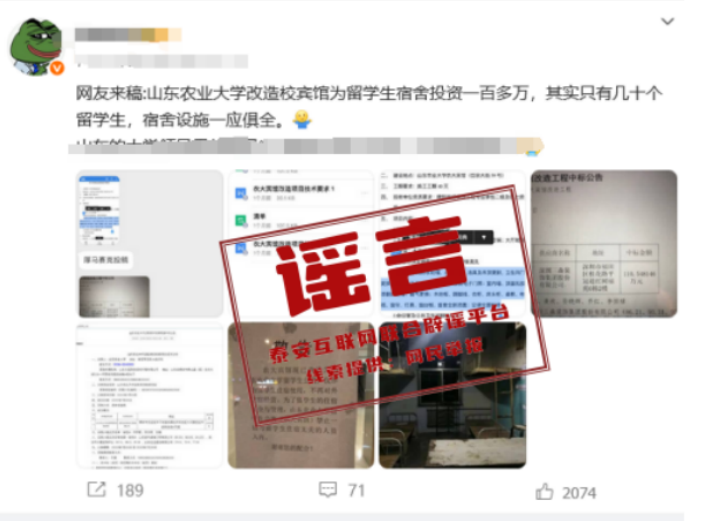案例四:辟除“山东农业大学斥资百万改宾馆为留学生宿舍”谣言