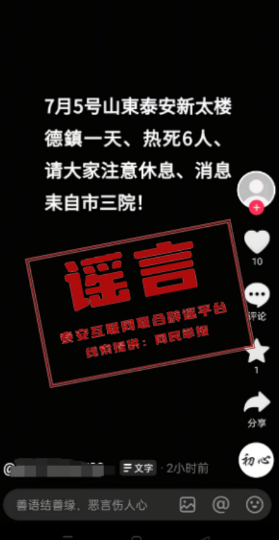 真相:7月,有网民在抖音平台发布“7月5日,泰安新泰楼德镇一天热死6人,请大家注意休息,消息来自市三院。”经核实,新泰市三院不存在类似收诊情况,且楼德镇无相关情况发生,此信息为谣言。经查,信息发布者为楼德镇薛家庄村村民张某,为博取流量吸引关注,编造信息发布。楼德镇和楼德镇派出所已对其本人进行了批评教育,发帖人认识到自己的错误后,随即删除了该信息。