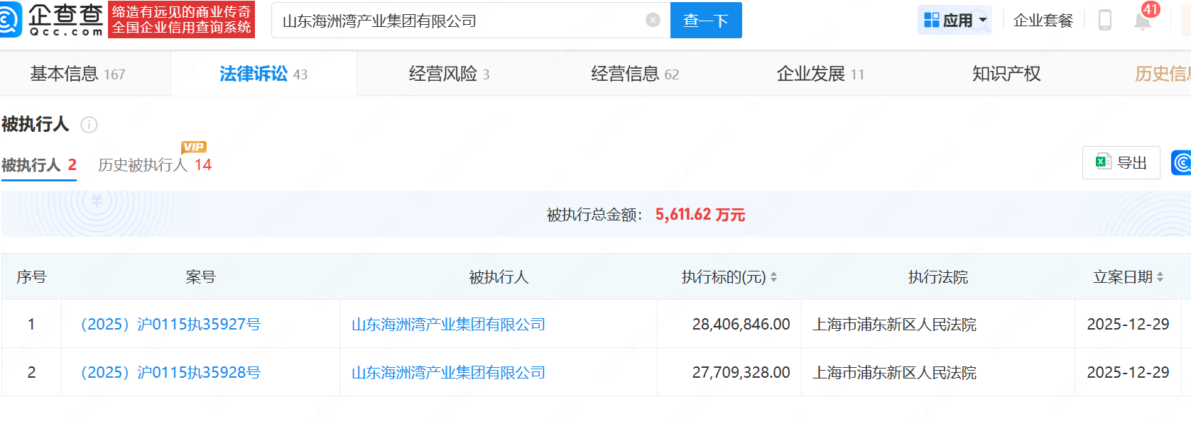 海洲湾产业集团目前有两条被执行人信息,均有上海市浦东新区人民法院于2025年12月29日同一天立案,执行标的分别为2770.93万元、2840.68万元,被执行总金额达5611.62万元。