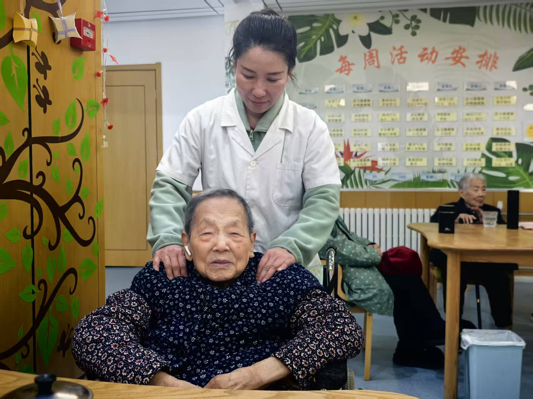 护理员为李淑华奶奶做按摩