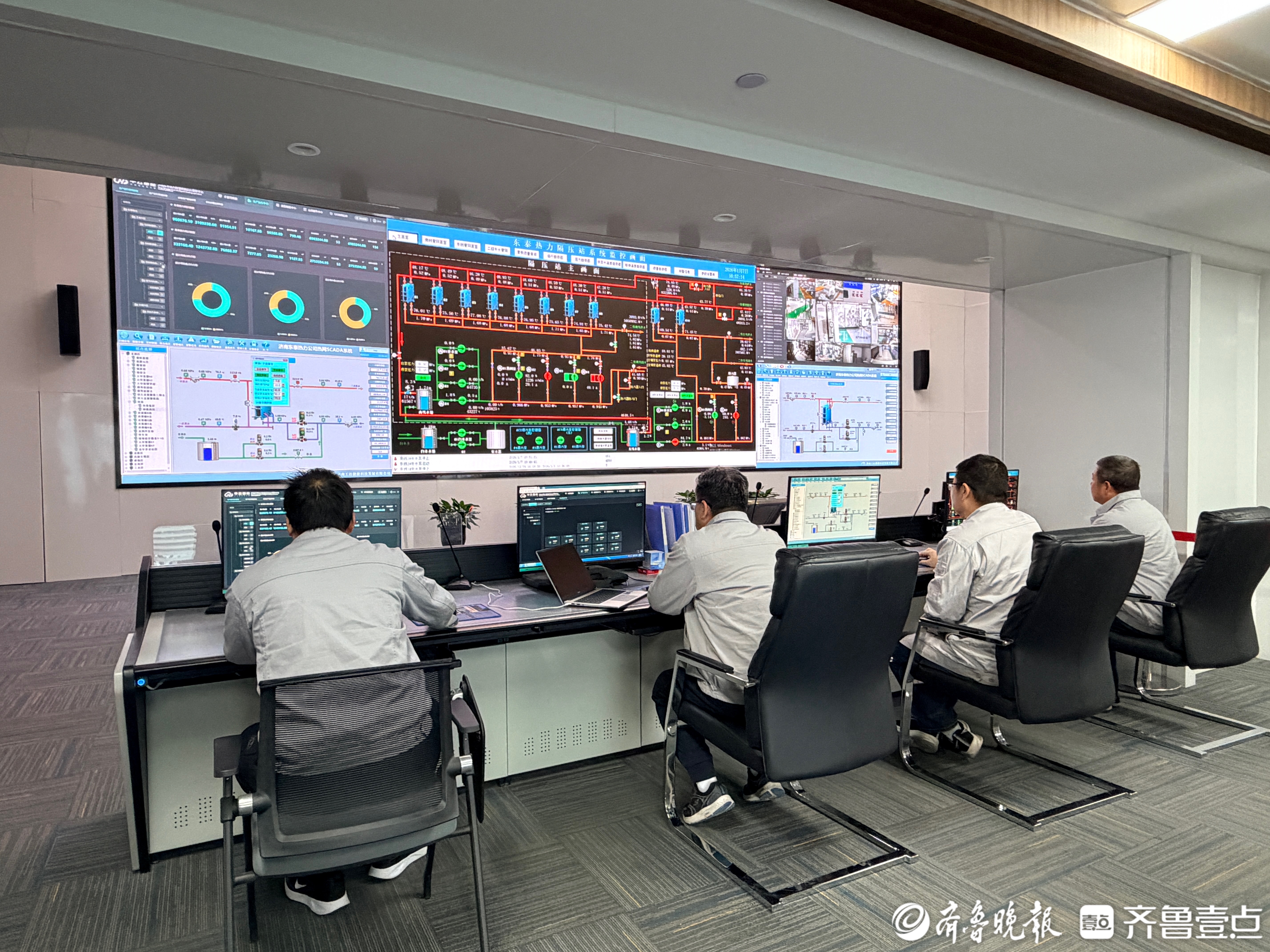 2025年12月12日晚,强冷空气席卷济南,带来大范围寒潮降雪天气,骤降的气温对供热企业提出了更高的要求。在东泰热力智慧供热调度中心内,安生部主管谭文晖正与值班人员实时关注着面前巨大的电子屏幕。屏幕上数百个换热站的压力、流量、温度等实时数据动态流转,勾勒出城市供热的“脉络图”。