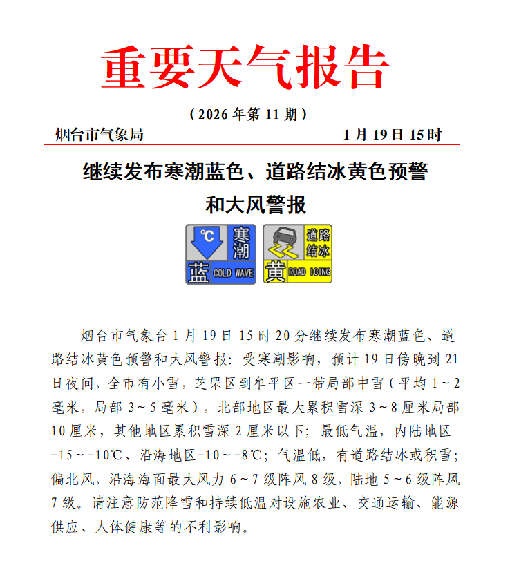从烟台市气象台获悉,1月19日15时20分,市气象台继续发布寒潮蓝色、道路结冰黄色预警和大风警报:受寒潮影响,预计19日傍晚到21日夜间,全市有小雪,芝罘区到牟平区一带局部中雪(平均1〜2毫米,局部3〜5毫米),北部地区最大累积雪深3〜8厘米局部10厘米,其他地区累积雪深2厘米以下;最低气温,内陆地区-15〜-10℃、沿海地区-10〜-8℃;气温低,有道路结冰或积雪;偏北风,沿海海面最大风力6〜7级阵风8级,陆地5〜6级阵风7级。