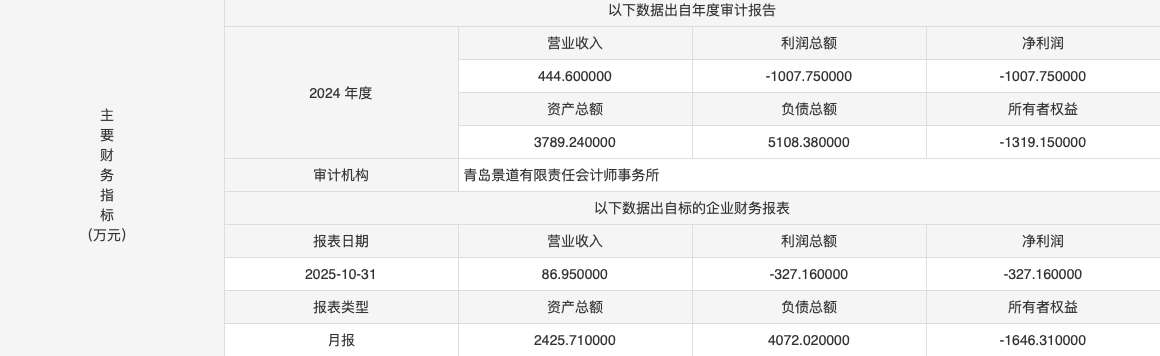 财务数据方面,2024年度,海西再生资源实现营业收入444.6万元、净利润-1007.75万元;2025年前10个月,该公司实现营收86.95万元、净利润-327.16万元。截至2025年10月31日,该公司资产总额为2425.71万元,所有者权益为-1646.31万元。
