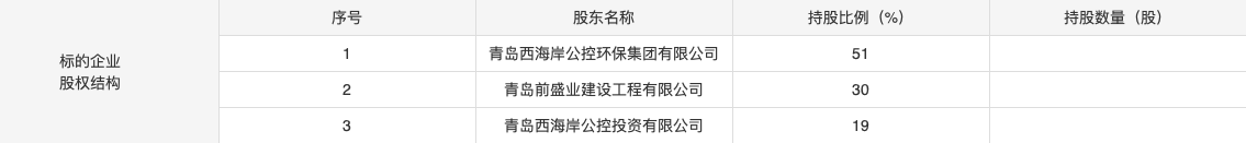 从股权结构来看,青岛西海岸公控环保集团有限公司持有该公司51%股权,青岛前盛业建设工程有限公司持股30%,青岛西海岸公控投资有限公司持股19%。上述项目的转让方为持股51%的青岛西海岸公控环保集团有限公司和持股19%的青岛西海岸公控投资有限公司。