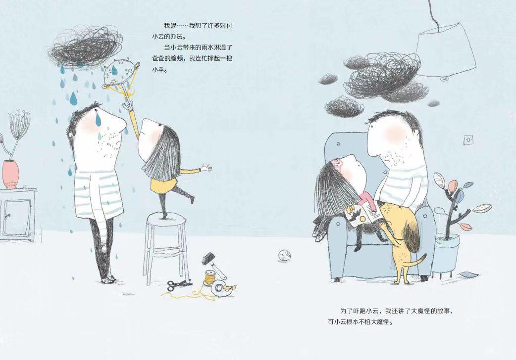 《爸爸头上有片小云》从儿童视角出发,讲述了深陷情绪雾霾的爸爸在家人关爱鼓励下自我修复的故事:赖在爸爸头上的“小乌云”让他做任何事都提不起精神,小女孩使出浑身解数,和妈妈以及宠物小伙伴们全家总动员,用无微不至的关心爱护,帮爸爸与情绪怪兽持续抗衡,终于让爸爸找回为孩子遮风挡雨的自信心和“爸爸力”。