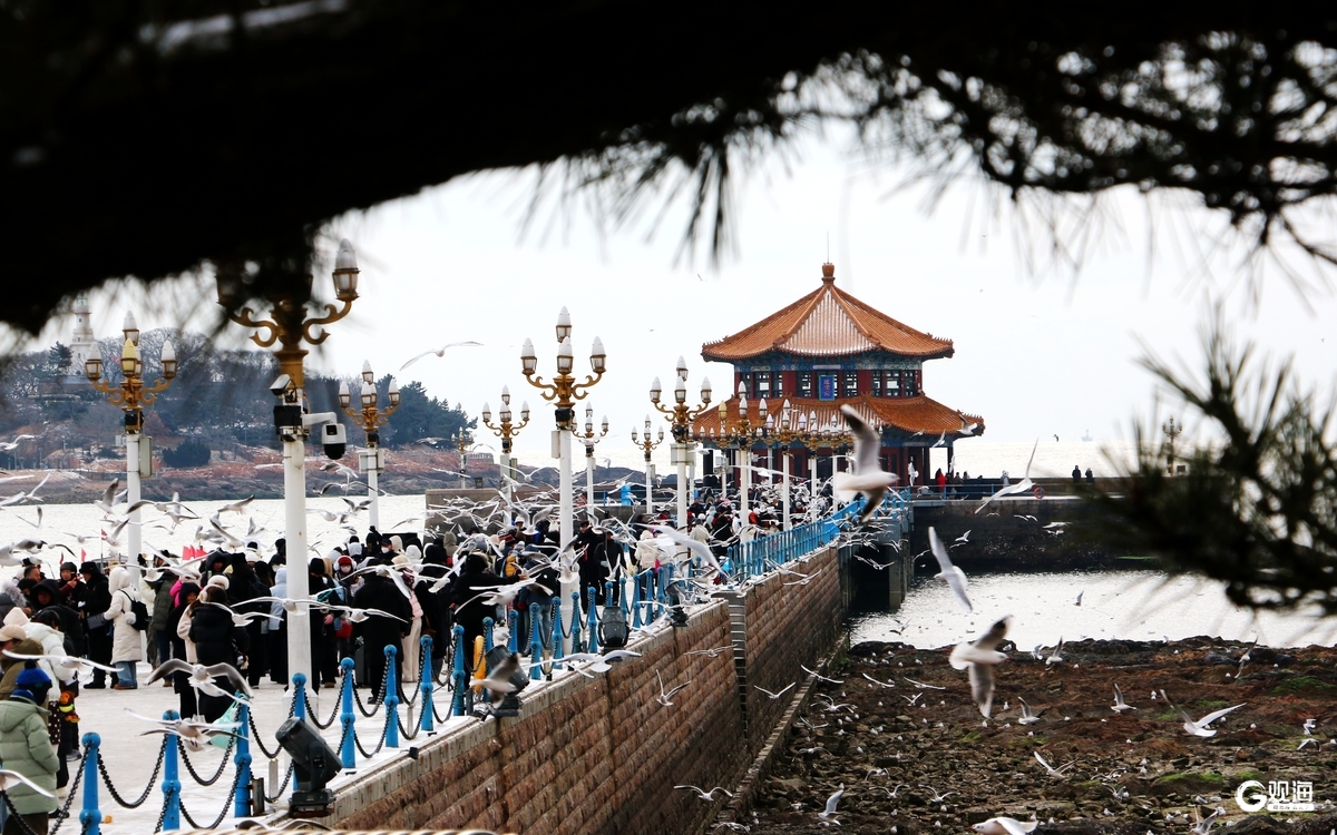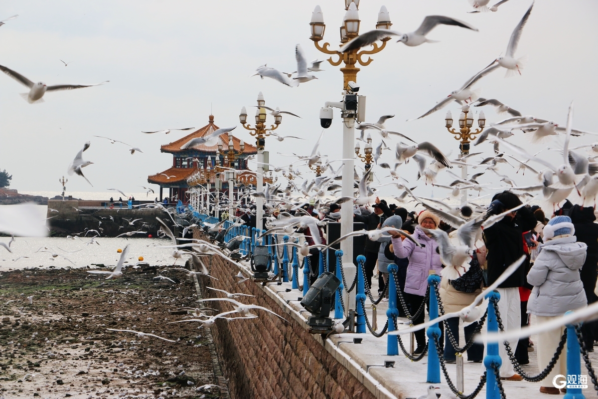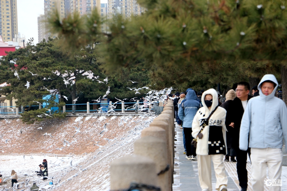 雪落栈桥,给青岛湾镀上一层柔光,百年长堤与回澜阁的飞檐在白雪中更显雅致。数万只海鸥如“白浪”翻腾,构成冬日限定的震撼盛景。游人举着鸥粮轻笑,精灵般的红嘴鸥俯冲衔食,人与海鸥的默契互动,让寒意都化作温柔。雪色、鸥白、海蓝交织,栈桥的冬日浪漫,藏在每一次振翅与欢笑里。