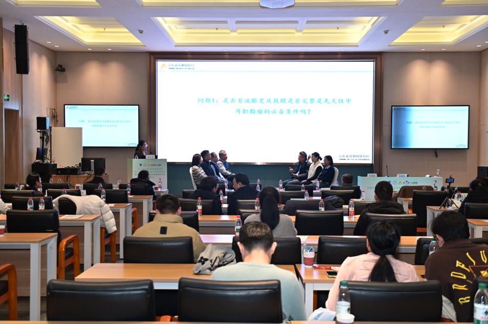 两场圆桌讨论环节气氛热烈。首场围绕“粘连性中耳炎——咽鼓管开放障碍还是异常开放?”这一临床争议话题,山东省第二人民医院(山东省耳鼻喉医院)高端医疗部主任樊兆民教授与多位专家结合病例各抒己见,展开了深度思辨。另一场则聚焦“先天性中耳胆脂瘤诊疗”,与会专家就诊断标准、手术时机与术式选择等关键问题交换意见,共同探讨更优的临床治疗策略。