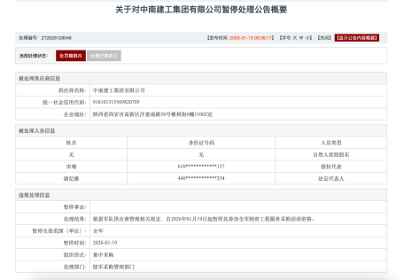 《关于对中南建工集团有限公司暂停处理公告》(处理编号:ZT2026128046)显示,经调查,中南建工集团有限公司在参加军队采购活动中,涉嫌存在违规失信行为。根据军队供应商管理相关规定,自2026年1月19日起暂停中南建工集团有限公司参加全军物资工程服务采购活动资格。