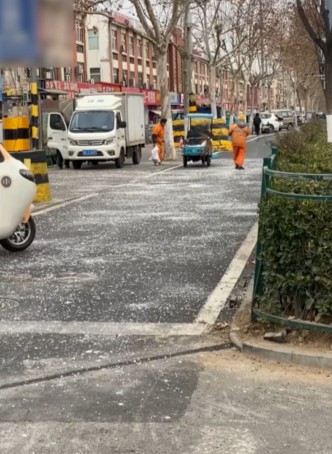 该街道环卫所负责人对此表示,“基于天气预报,针对坡道等易滑路段进行了预防性撒布,使用的是环保型融雪剂。”