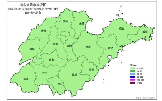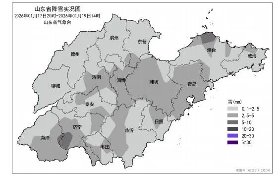 2026年1月17日20时—1月19日14时全省降雪实况(毫米)1 月 17 日 20 时至 19 日 14 时,全省普遍出现降雪,平均降雪量 2.3(毫米,下同)。各市平均:淄博 3.3、潍坊 3.1、青岛 3.1、济宁 3.0、烟台 2.7、菏泽 2.5、枣庄 2.4、临沂 2.3、日照2.3、东营 2.1、泰安 2.0、济南 2.0、滨州 1.9、威海 1.8、德州 0.8 和聊城 0.5。县(市、区)平均降雪量超过 5.0 的2 个,2.5—5.0 的 53 个,0.1—2.5 的 68 个,前 3 位的是:济宁金乡 6.1、烟台蓬莱 6.0 和淄博博山 4.8。