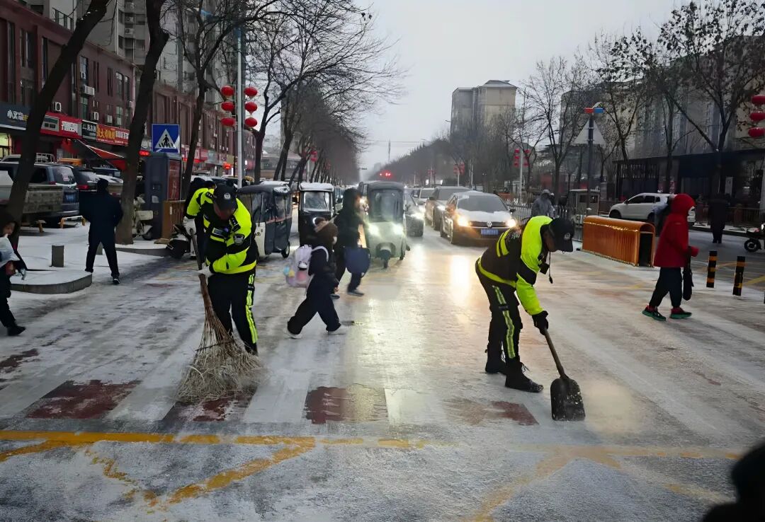 滕州市局及时调配警力,以辖区主干路、校园周边等路段为重点,组织民辅警进行铲冰除雪。