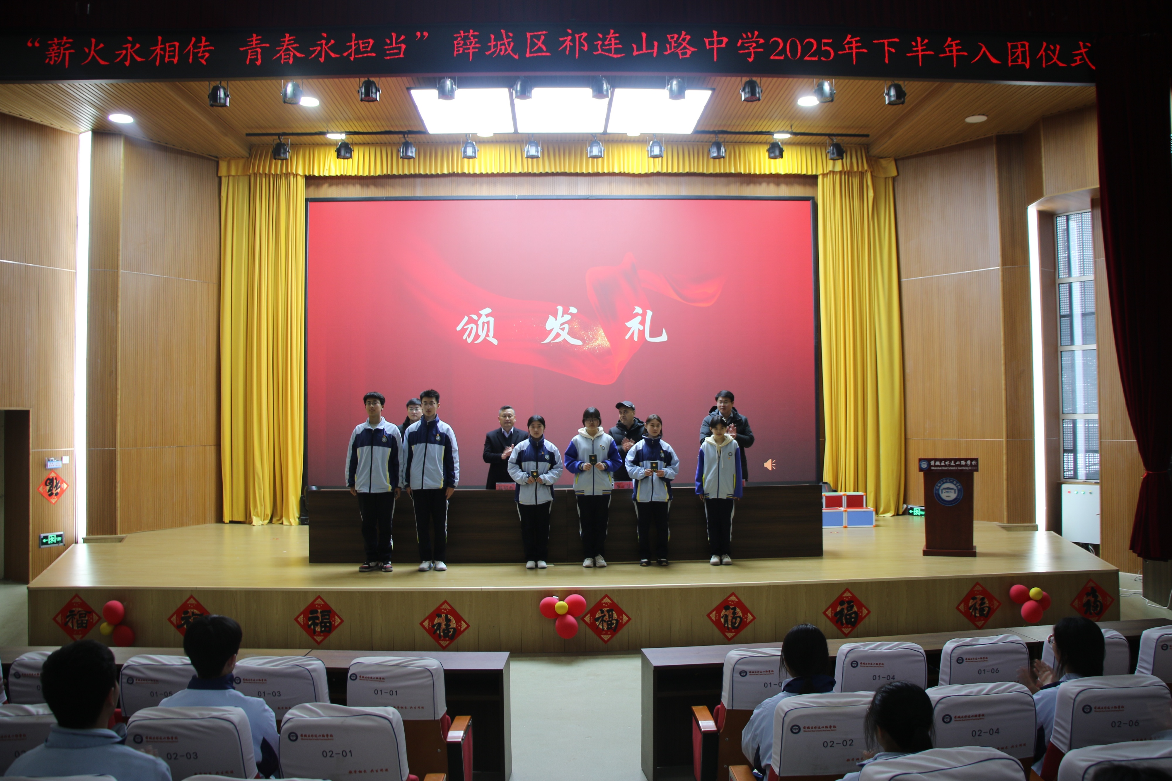 团委彭振老师宣读了2025年下半年新发展团员名单,张铭航、闫茹钰等38名同学光荣加入中国共产主义青年团。在全场师生的共同见证下,校领导为新团员佩戴团徽。新团员们的脸上洋溢着自豪与激动,这枚小小的徽章,既是一份光荣的荣誉,更是一份沉甸甸的责任。