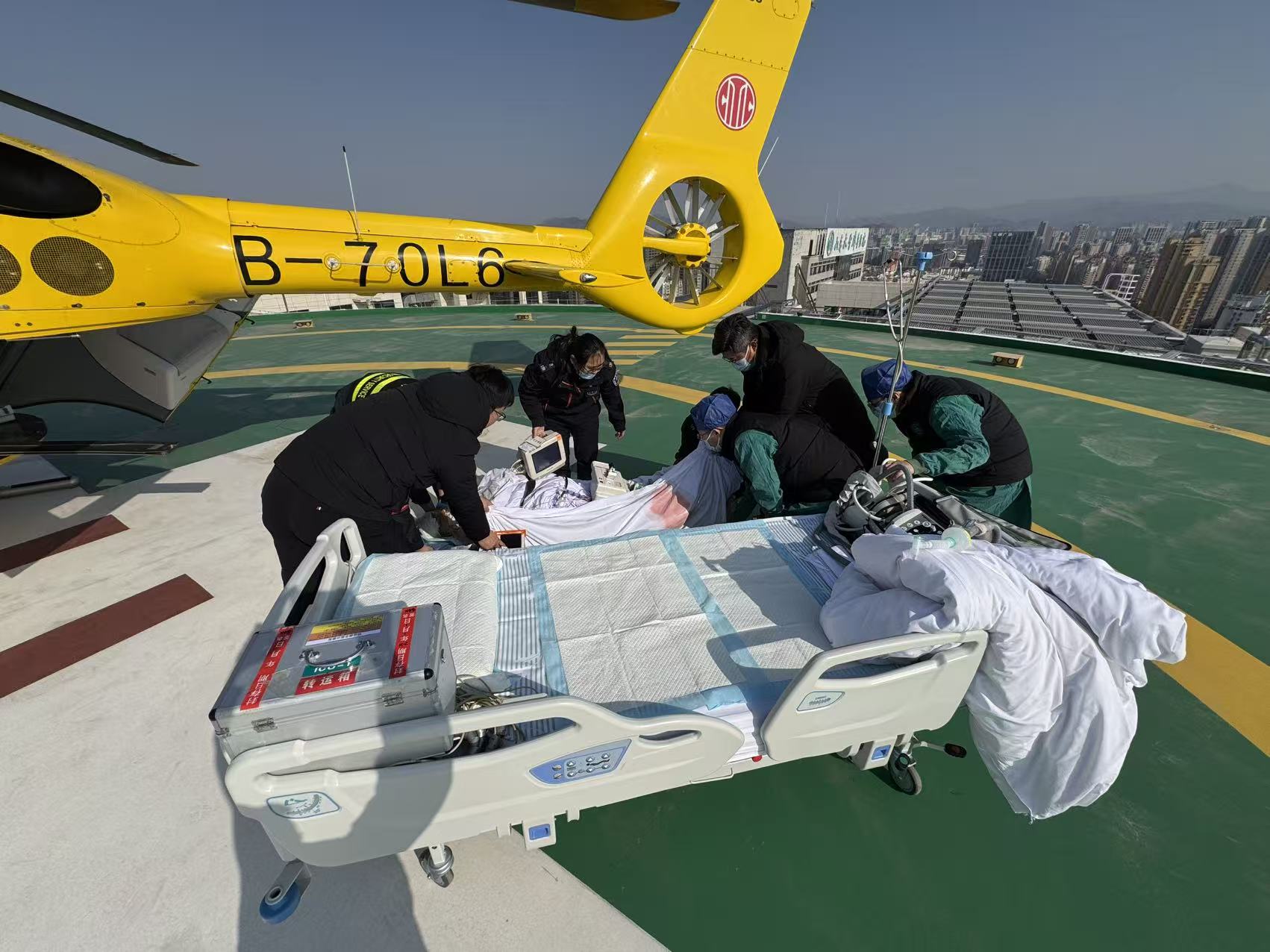 1月17日,青岛市急救中心接到西海岸新区人民医院求助,一名约50岁男性因车祸导致全身多发复合伤并休克,病情危重。经过山东大学齐鲁医院(青岛)专家会诊,积极抢救治疗,目前患者依靠呼吸机辅助呼吸,通过六组微量泵持续维持生命体征,急需转上级医院进一步救治。若采用地面救护车转运,需要一个半小时左右,加上途中颠簸,对于该例合并颅脑、胸部等严重外伤的患者来说风险极高,为争取宝贵的抢救时间,经综合评估,青岛市急救中心决定启用航空医疗救援。