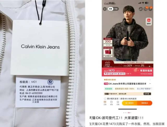 1月19日,界面新闻查阅小红书等社交平台发现,确实有网友发类似帖子。还有不少网友晒出的相关吊牌显示,波司登还为其他国际服装品牌代工。界面新闻查询天猫Calvin Klein官方旗舰店,其男女款羽绒服售价1300到3000元不等。