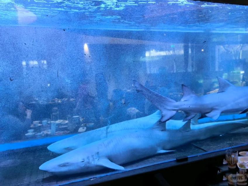 太原一网红餐厅的鱼缸内喂养鲨鱼。受访者供图