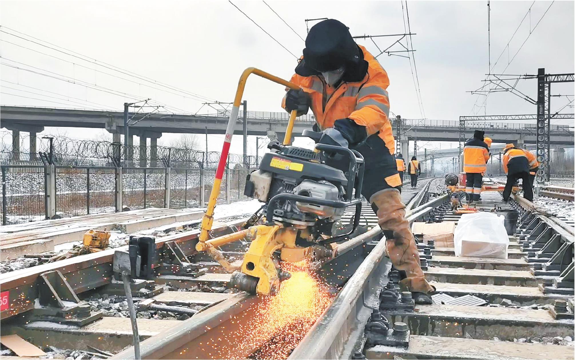记者贺辉报道 1月19日,国铁济南局济南工务段工作人员在党家庄站进行钢轨打磨。
