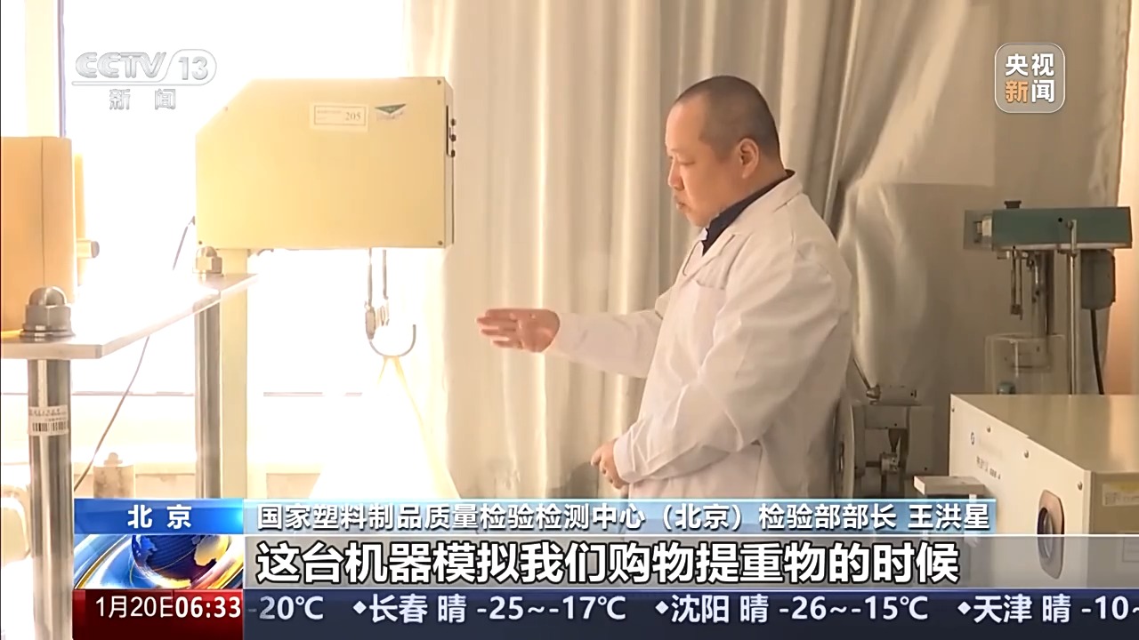 国家塑料制品质量检验检测中心(北京)检验部部长 王洪星:这台机器模拟我们购物提重物走路的时候,可能会有自然的抖动。提吊是按照固定频率1800次。如果不出现问题,就算合格。