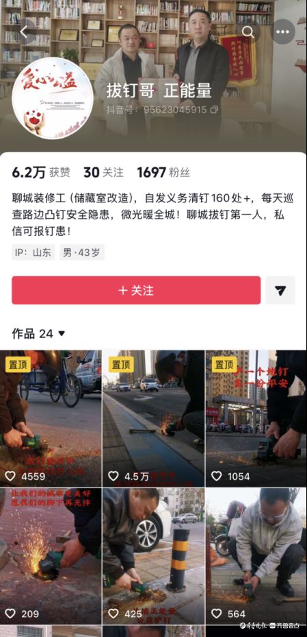 近日,热门短视频平台上一位昵称为“拔钉哥 正能量”的聊城装修工人意外走红,引发全网关注。“拔钉哥”名叫孙华国,凭借义务清除路面凸钉的公益行动,他在短视频平台累计收获超6万网友点赞,从个人善举到社会共鸣,打响了一场“城市安全保卫战”。