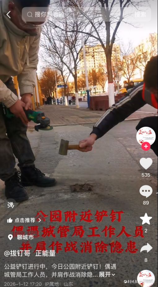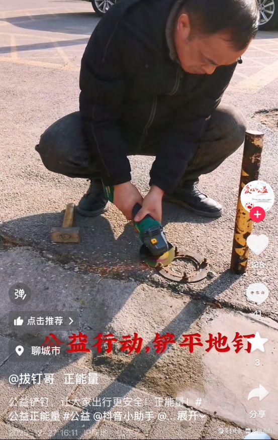 2025年12月27日,孙华国在短视频平台上发布了第一条拔钉视频。画面中,他蹲在街头,专注地打磨一颗凸钉。视频配文很简单:“公益铲钉,让大家出行更安全。”