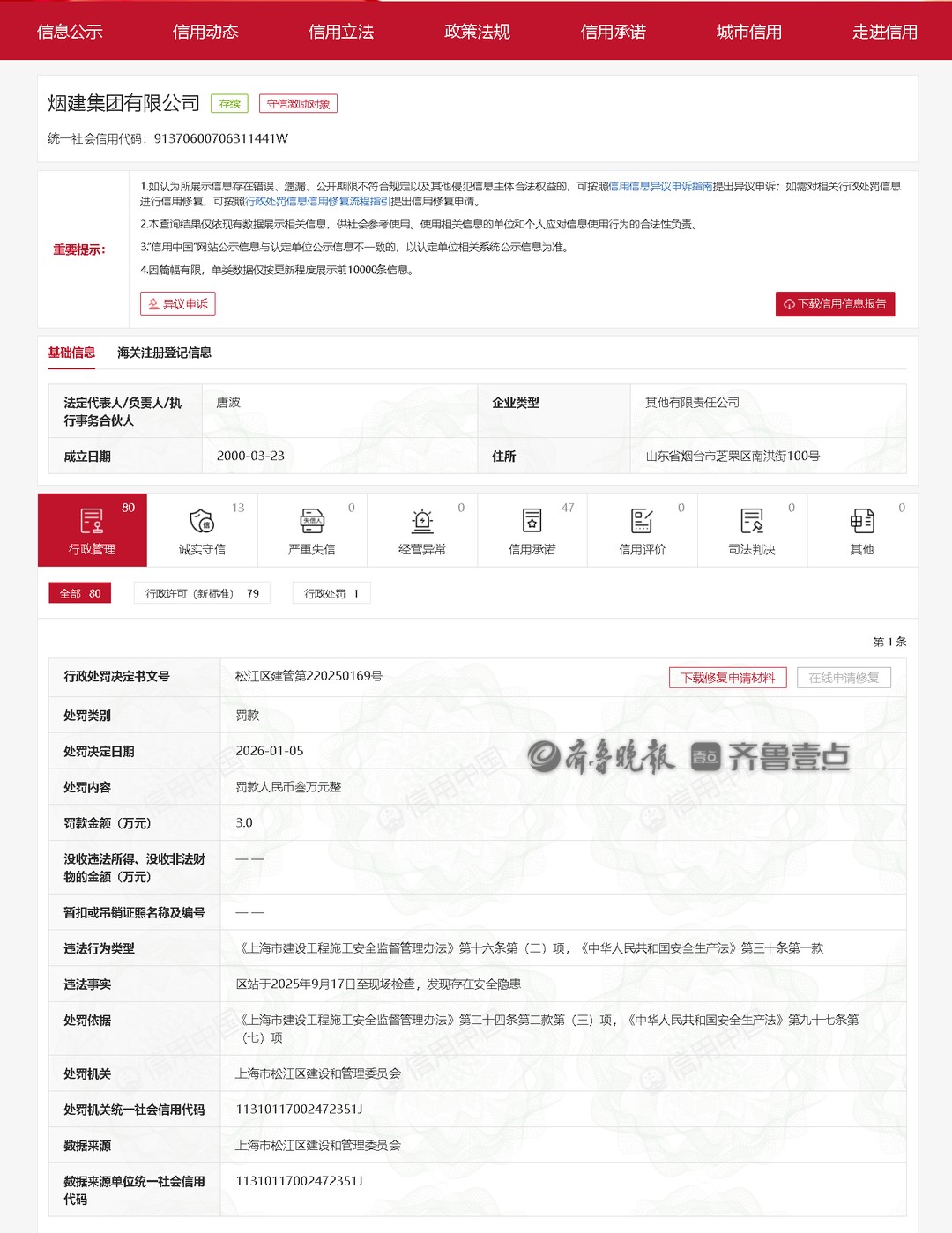 近日,齐鲁晚报·齐鲁壹点记者从信用中国获悉,烟建集团有限公司因安全隐患问题,被上海市松江区建设和管理委员会罚款3万元。