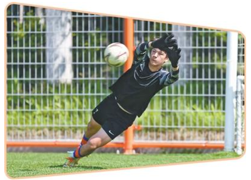 站在门前,周海滨并不着急扑救,他指着场上的人墙板,向队员讲解角球要点。队员轮流上场练习,他紧盯每个人的动作,不时指导:“球的方向是好的,但角度有点低……”