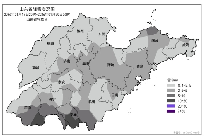 从过程降雪量来看,17日20时至20日6时,全省普遍出现降雪,平均降雪量2.9(毫米,下同)。各市平均:枣庄9.9、菏泽4.4、济宁3.9、临沂3.4、淄博3.3、潍坊3.1、青岛3.1、烟台2.9、日照2.3、东营2.1、泰安2.0、济南2.0、滨州1.9、威海1.8、德州0.8和聊城0.5。降雪量前3位的是:枣庄薛城13.5、枣庄峄城12.7和枣庄台儿庄11.5。