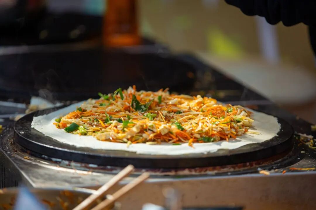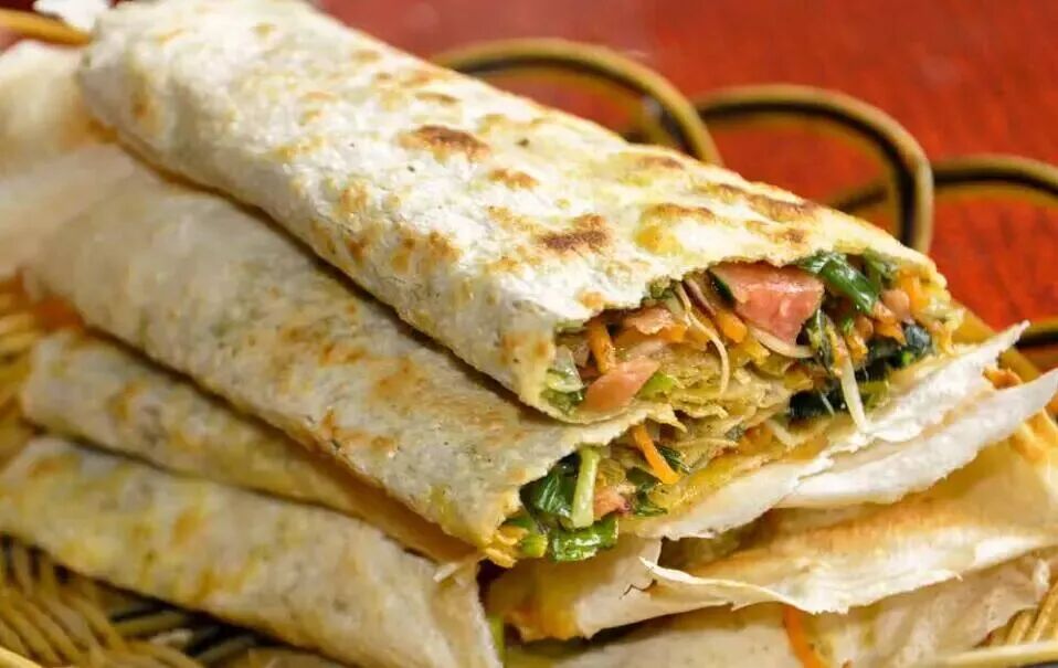 杂粮煎饼卷上土豆丝、胡萝卜丝等蔬菜,一口下去,先是焦脆脆的杂粮饼香,再是清甜爽口的菜香,口感层次丰富,唇齿留香。