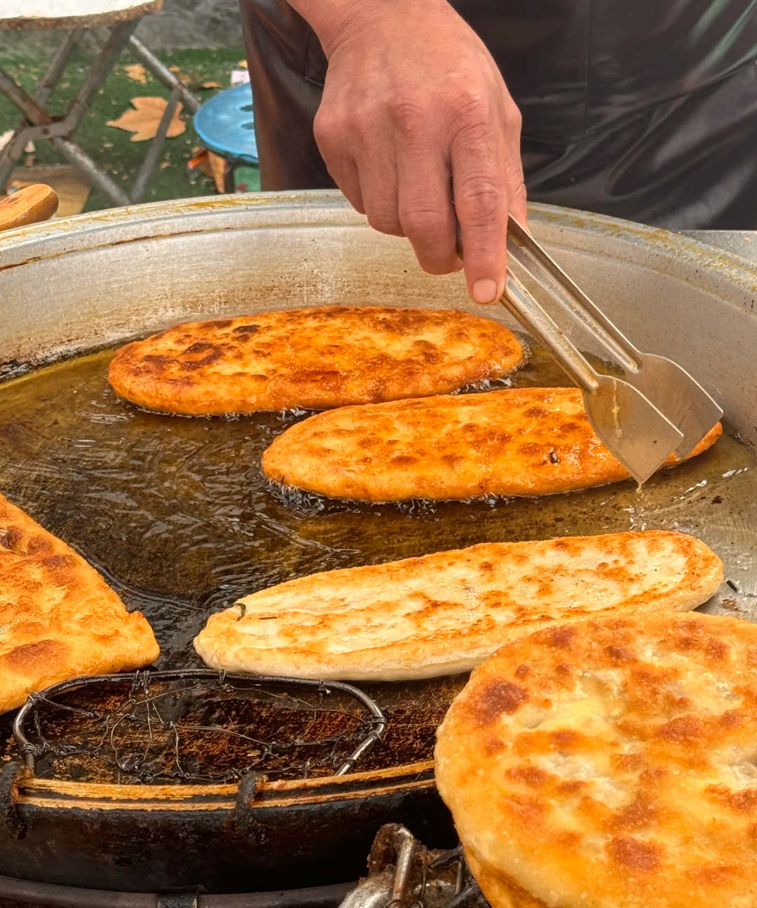 面团在老师傅手中抻开、抹馅、折叠,旋即滑入热油——“呲啦”一声,唤醒了整座城的味觉。