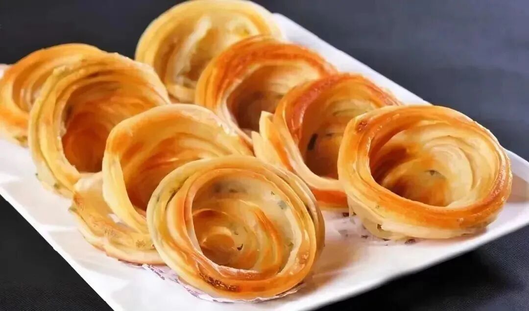 刚出炉的油旋滋滋作响,金黄螺旋状的表面泛着油亮光泽,一层层酥皮薄如蝉翼,轻轻一触便簌簌落下。