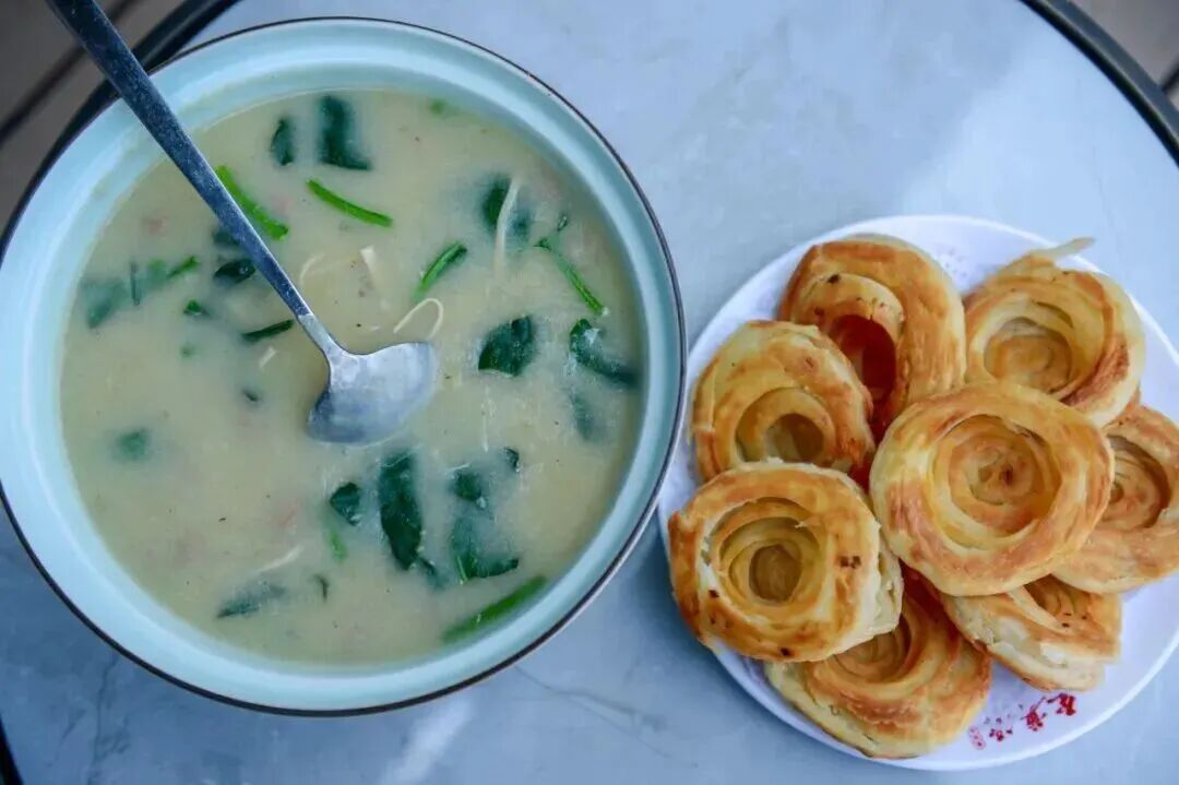 赶早的人往早餐摊一坐,张口就是一句 “来碗甜沫儿,加俩油旋”。