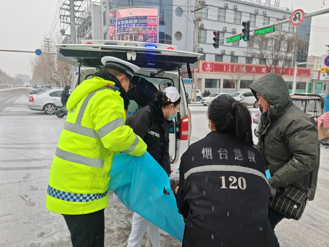 ▲ 1月18日,莱阳市公安局交管大队执勤交警巡逻时,发现一名老人因雪天路滑摔倒受伤。民辅警当即疏导过往车辆、安抚老人,同时拨打120急救电话,协助老人及时送医。