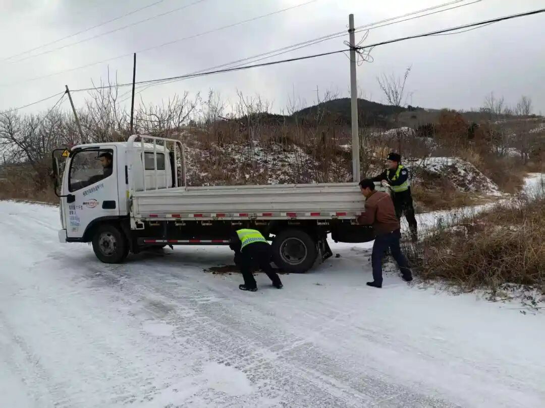 ▲ 1月19日上午,栖霞市公安局交管大队亭口中队民警巡逻途中,发现一辆轻型货车因路面积雪结冰打滑,横在坡道无法驶离。民警随即合力帮驾驶人脱困,又有序引导滞留车辆驶离,及时消除道路安全隐患。