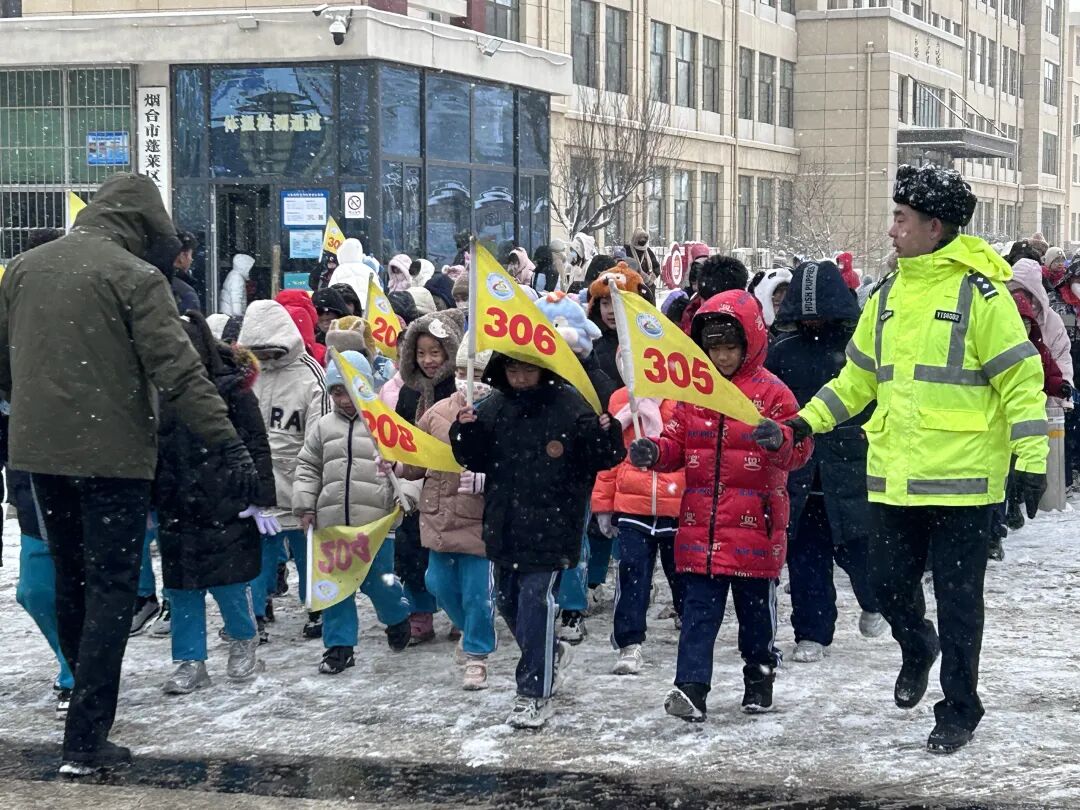 ▲1月19日,烟台市公安局蓬莱分局交管大队执勤交警雪中坚守“护学岗”,护送孩子们安全过马路。