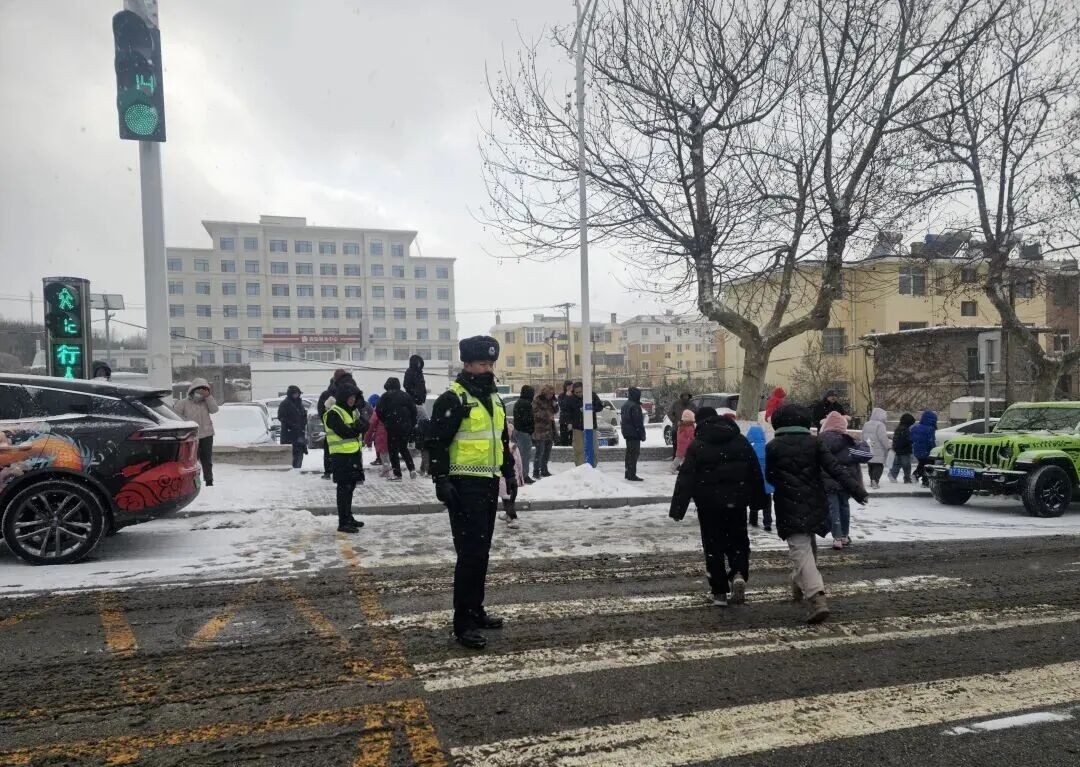 ▲1月19日,烟台市公安局长岛分局交管大队民警辅警在学校路口执勤,指挥交通,护送孩子放学,并叮嘱家长雪天路滑,安全驾驶。