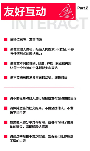 在友好互动板块还提出请尊重他人隐私,拒绝人肉搜索,不发起、不参与任何形式的网络暴力;请保持适当的社交距离,不要骚扰他人,不发送不当内容。