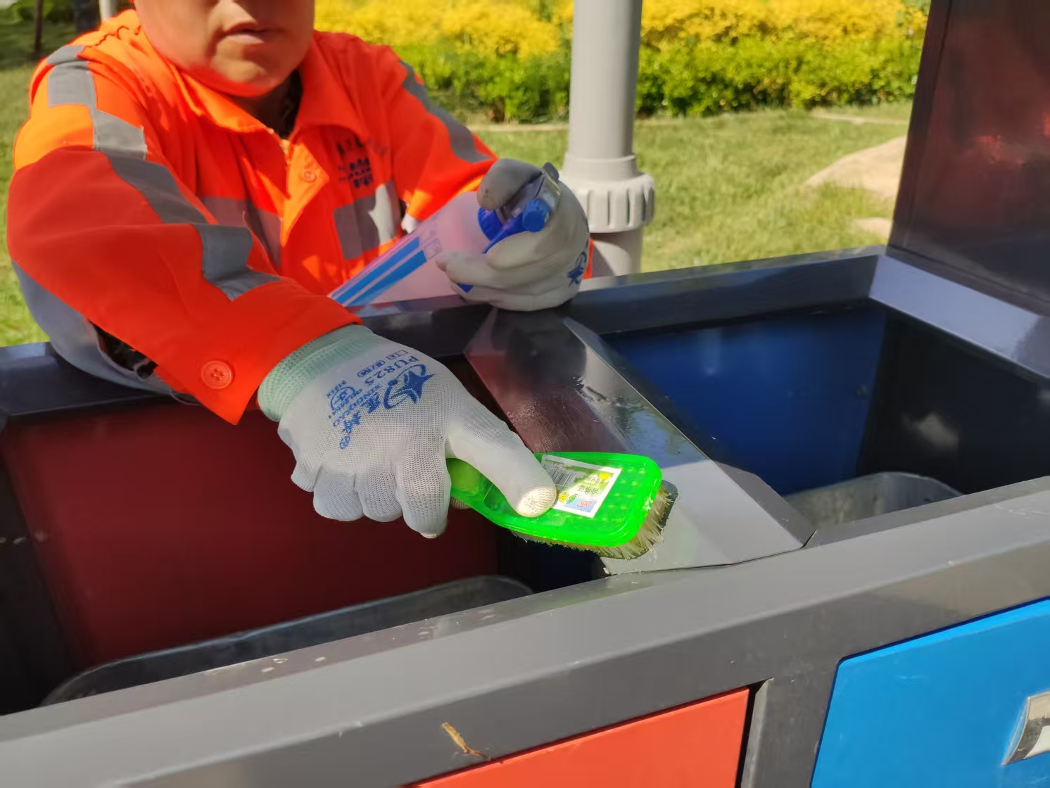 “以前清理一处小广告,总要往返工具车取好几趟东西。现在‘八宝袋’往腰上一挂,走到哪儿、清到哪儿,效率高多了!”正在腊山河西路作业的马阿姨熟练地从袋中取出钢丝刷,对着箱体上的顽固胶痕细细清理。不远处,几位刚从腊山河公园遛弯出来的市民路过,看着洁净整洁的街道忍不住夸赞:“这儿的环境是越来越好了,连带着心情都舒畅!”这套便携式装备搭配精细作业,让环卫工人化身城市家具的“精致养护师”,从地面口香糖残渍到果皮箱胶痕,从灭烟柱积垢到电线杆涂鸦,每一处卫生死角都能得到精准清理。