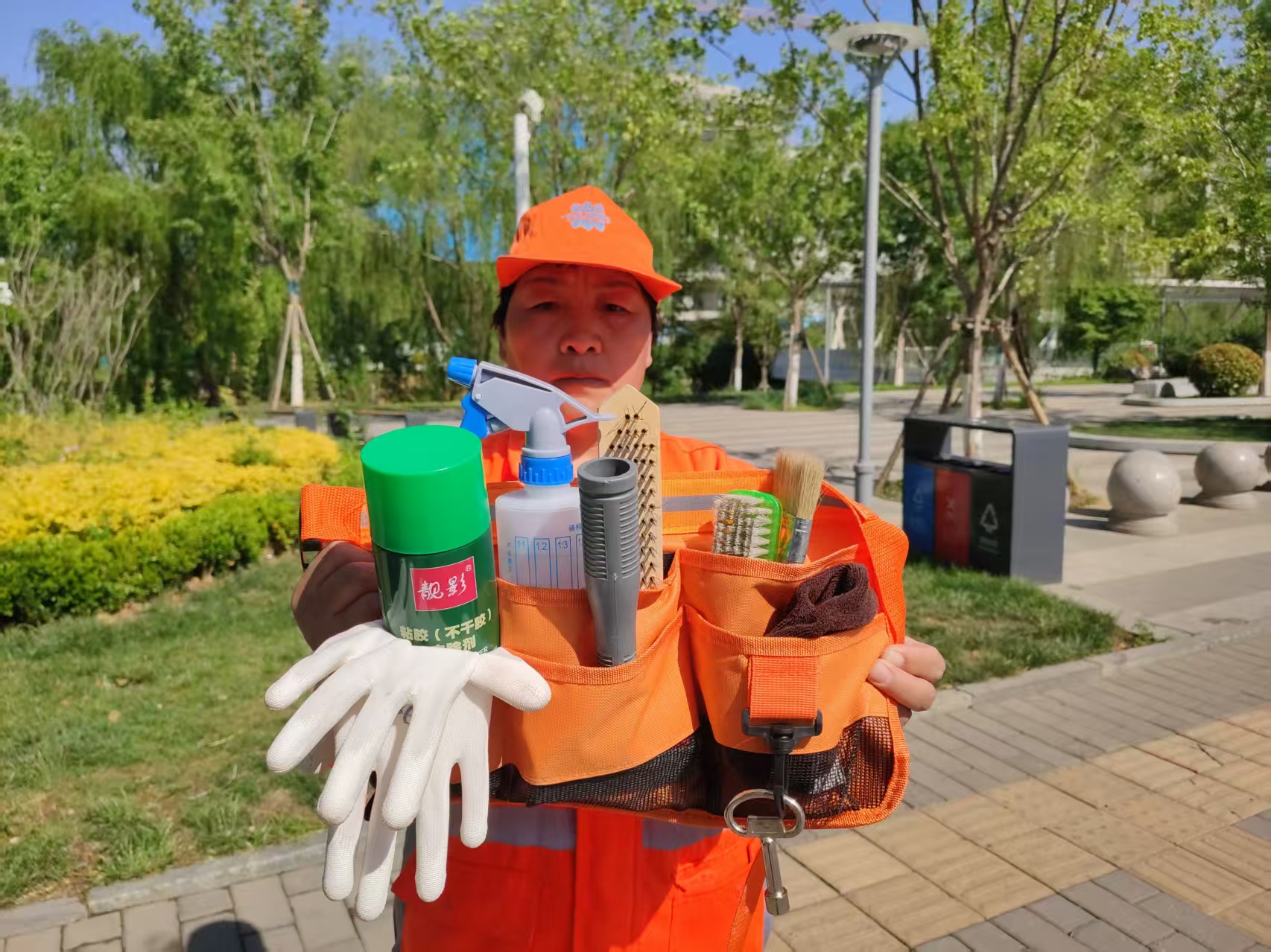 “八宝袋”听起来颇有几分神秘,其实它就挂在每位一线环卫工人的腰间——一个设计轻便、收纳合理的工具包。这个看似朴素的“随身锦囊”,实则是破解街头保洁“疑难杂症”的智慧结晶。袋中精心配备了铲子、刷子、除胶剂等八样专业工具,针对不同类型污渍“对症下药”。