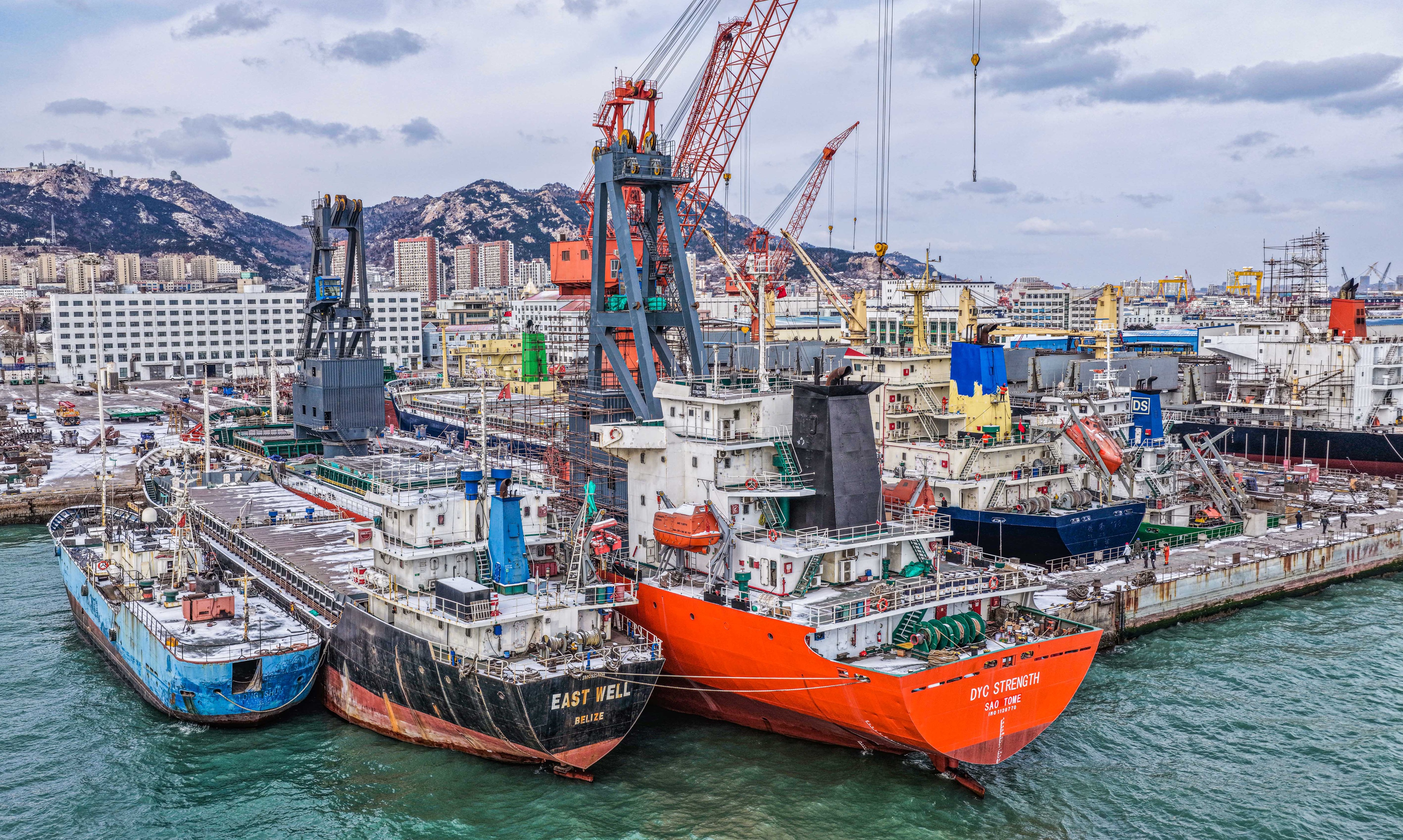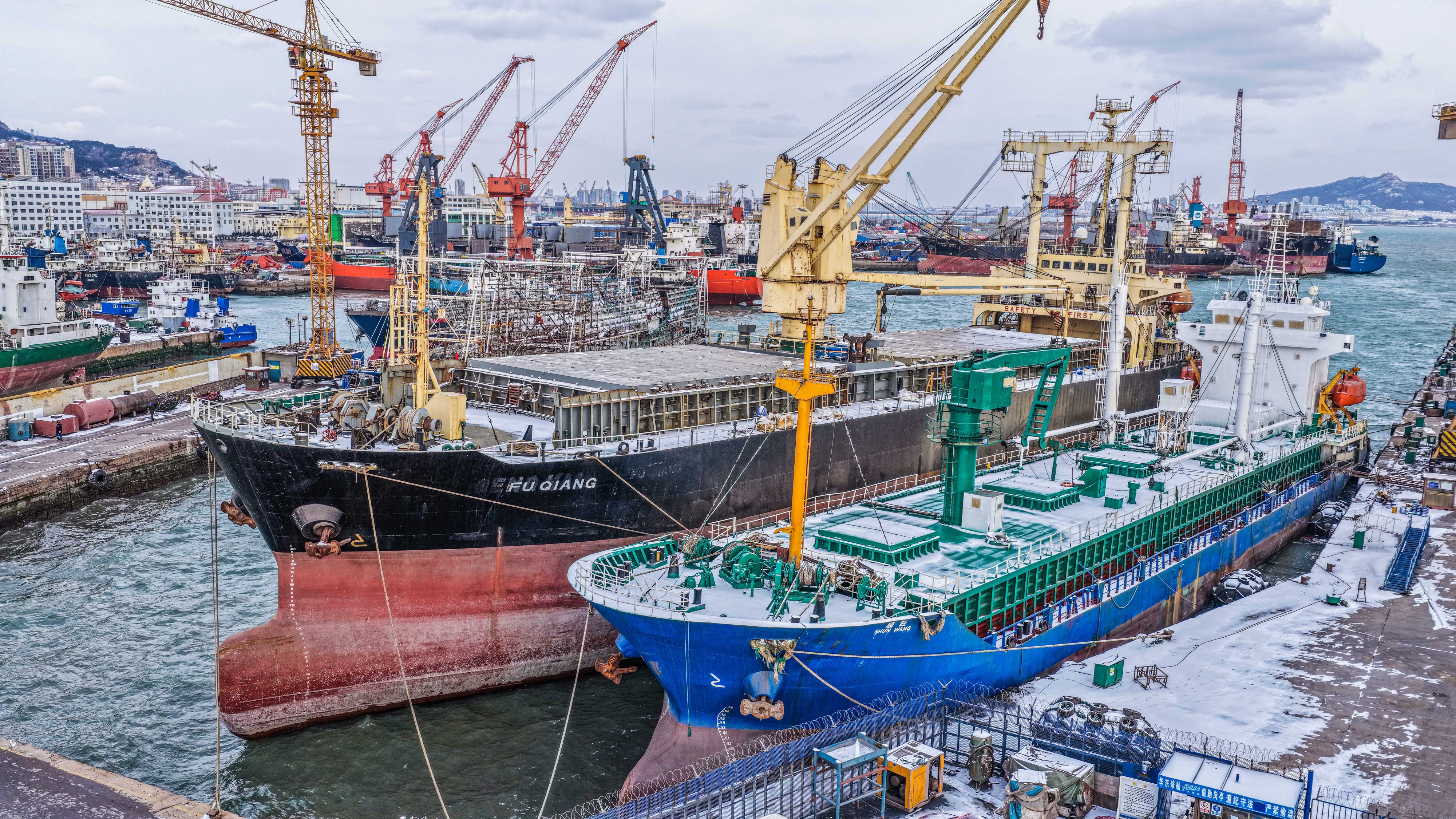 1月19日,在荣成市石岛管理区港湾街道一家民营船舶修造企业船坞内,多艘待修大型船舶整齐停靠,焊花飞溅、吊臂起落,工人加紧施工作业,一派繁忙景象。
