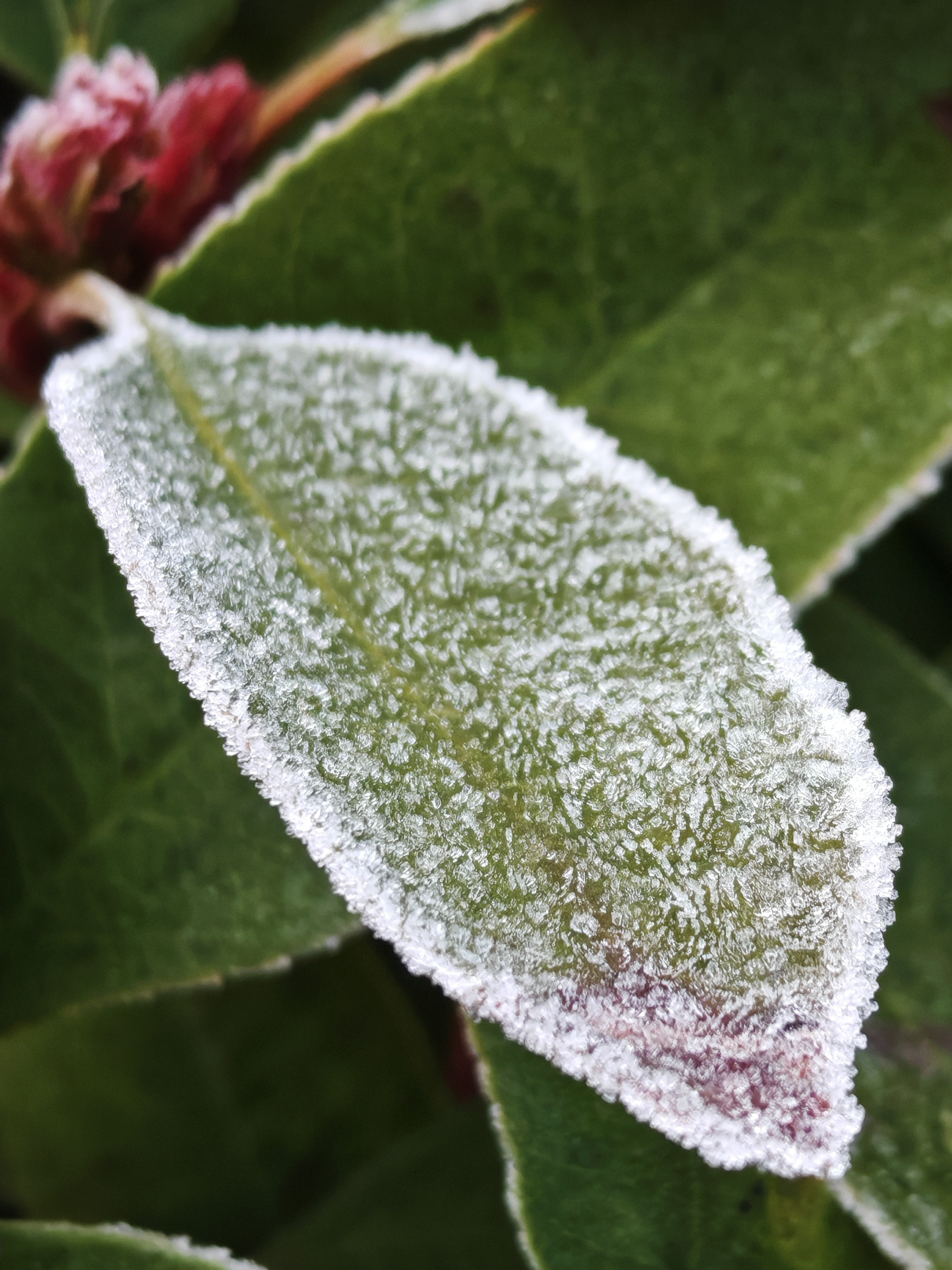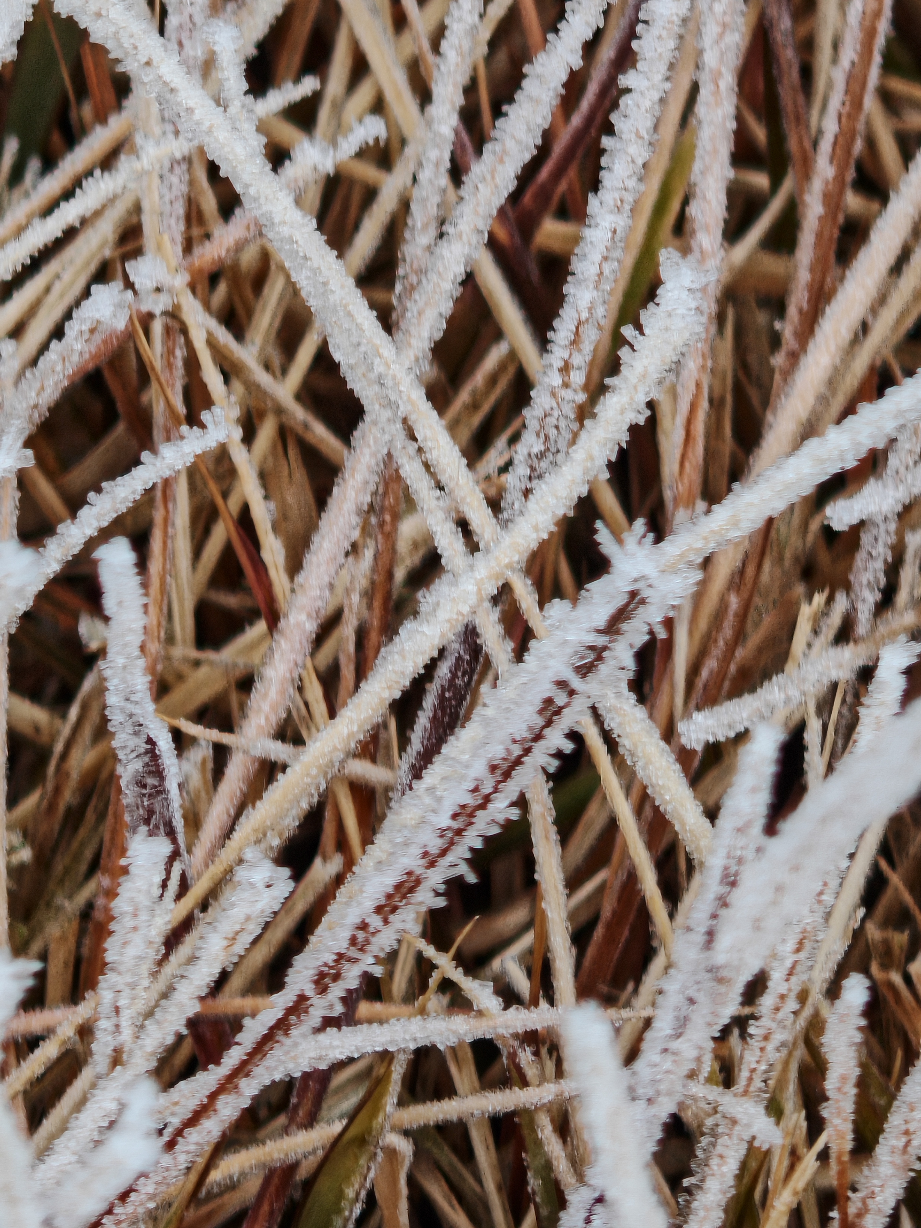 霜花,是冬夜绘就的素色图腾,在晨光的映照下,霜花泛着细碎的银光,像撒了一把揉碎的星子。(聊城市工业和信息化局董艳蕾拍摄)