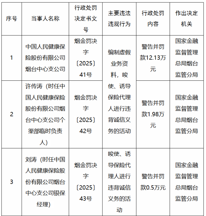 近日,国家金融监督管理总局山东监管局官网公示的行政处罚决定书(烟金罚决字〔2025〕41号)显示,中国人民健康保险股份有限公司烟台中心支公司因编制虚假业务资料,唆使、诱导保险代理人进行违背诚信义务的活动被警告并罚款12.13万元。同时,许传涛(时任中国人民健康保险股份有限公司烟台中心支公司个渠部临时负责人)被警告并罚款1.98万元;刘涛(时任中国人民健康保险股份有限公司烟台中心支公司银保经理)被警告并罚款0.5万元。