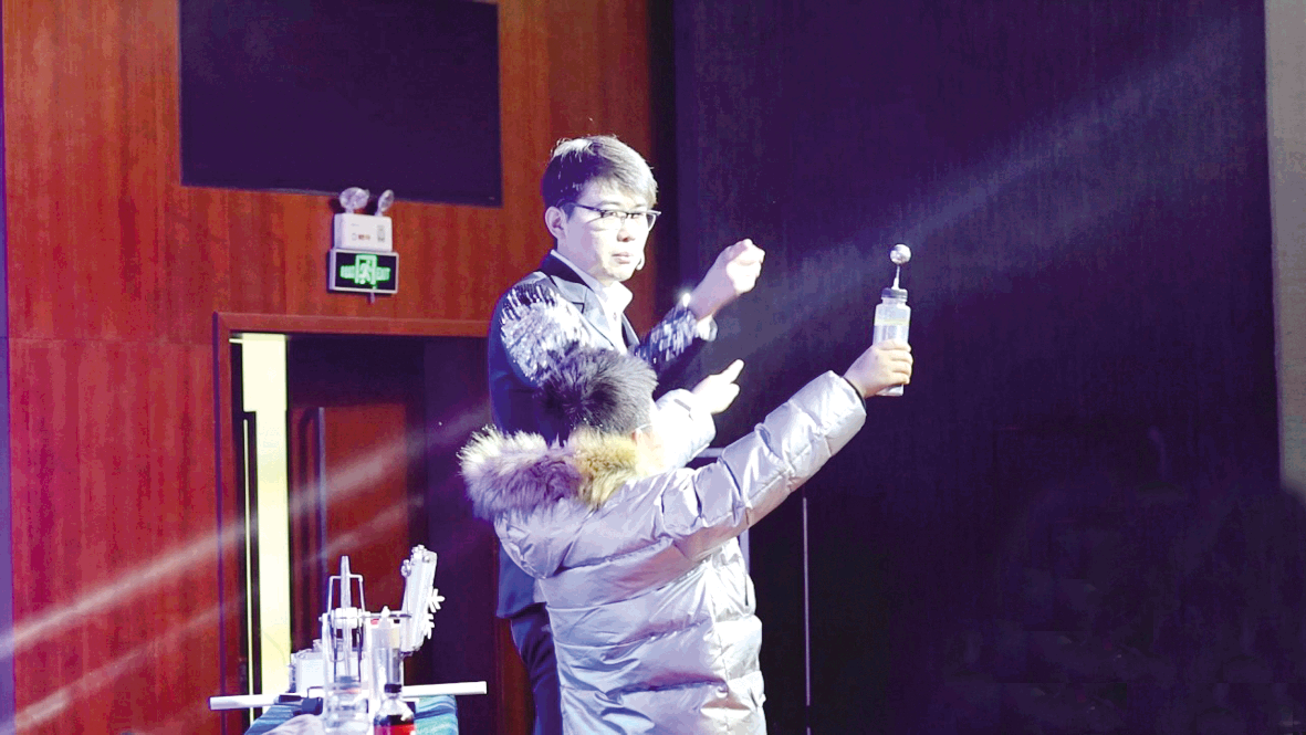 莱顿瓶的互动实验更是将趣味拉满,十几个孩子手拉手围成一圈,两侧的孩子握住莱顿瓶,当双手相触的瞬间,微弱的电流顺着小手传递,一圈孩子都感受到了轻轻的麻意,惊呼声中满是对科学的探索欲。杨智明将专业理化知识揉进魔术的趣味与浪漫,幽默的话语、生动的演绎,让报告厅里的笑声一波接一波,一旁的家长们也忍不住跟着笑、跟着惊叹。