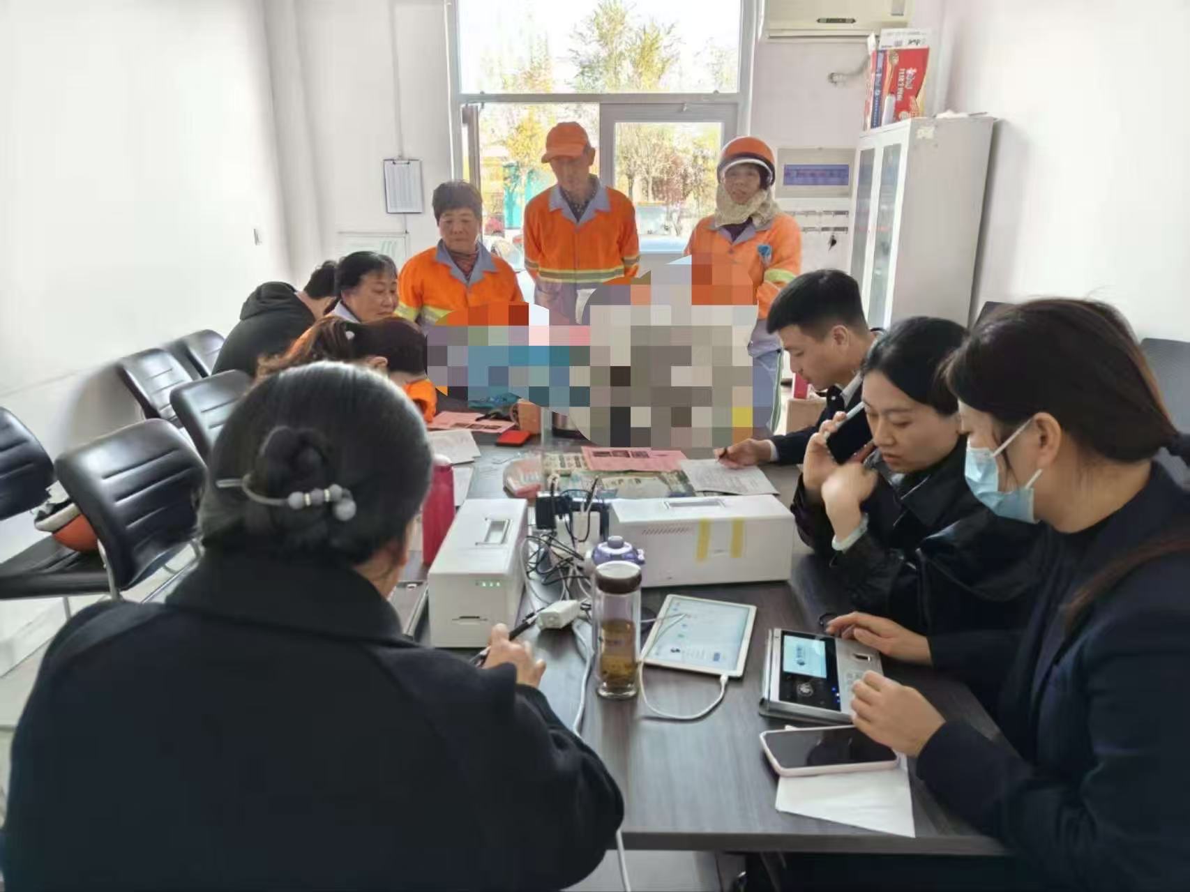 抵达现场后,工作人员迅速搭建起临时服务专区,铺设防滑垫,同时配备放大镜、老花镜和大号字体业务指引单,安排专人引导,让环卫工人办卡更安全舒心。